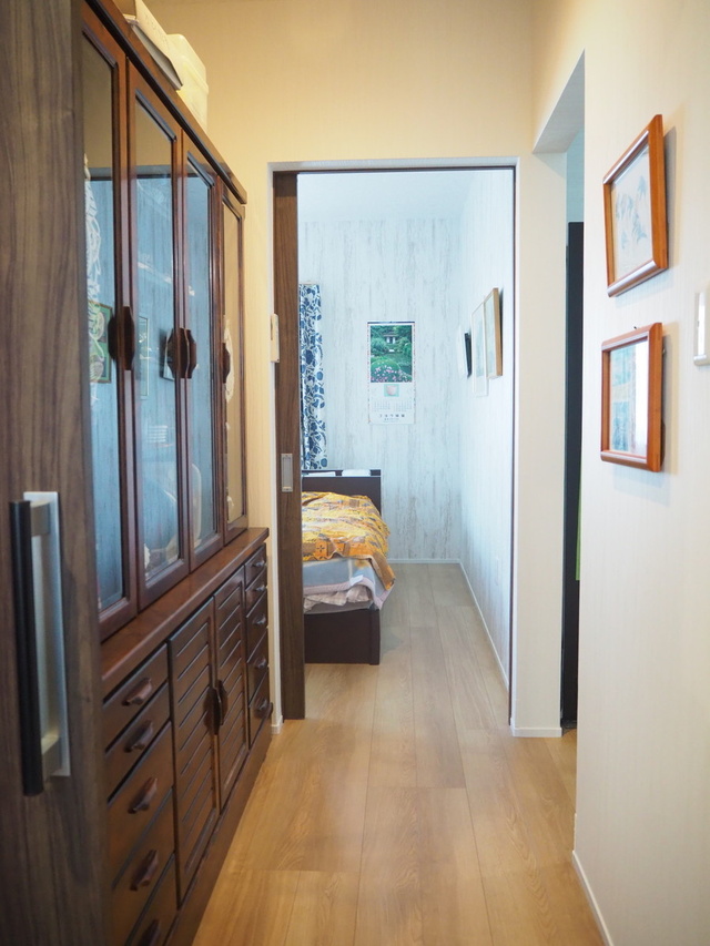 ご主人の書斎と寝室をつなぐ廊下には、壁の奥行きを調整して、持参した食器棚がジャストサイズで収まりました。