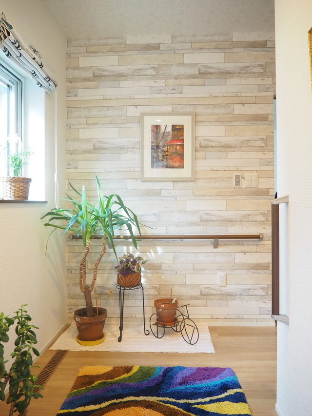 玄関ホールには、シャビーシックな板張り調の壁紙をポイントに使いました。街角を描いた絵がよく似合っています。美術館や画廊を見て回るのが趣味だというご夫婦。室内には、お二人が選んだ絵画があちこちに飾られています。