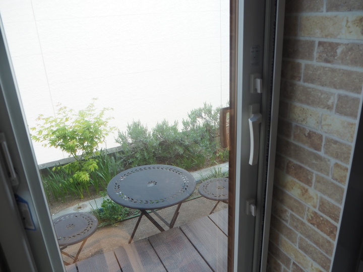 勝手口前のテーブルセットは、庭仕事の合間の休憩にぴったり。