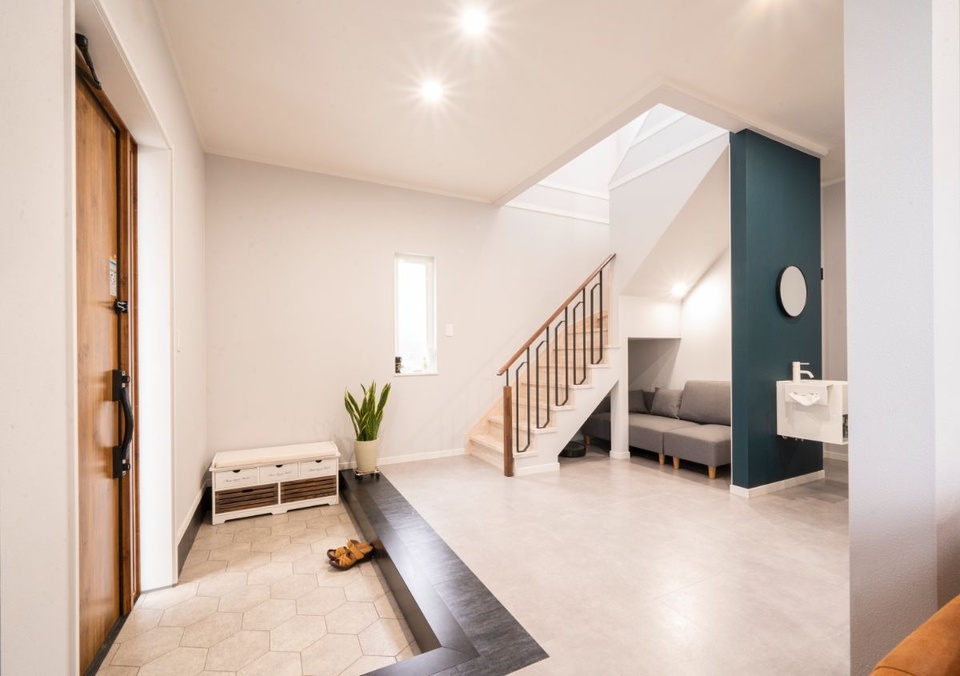 玄関土間を横に広くとった玄関ホール。帰宅後や来客があった時、すぐに手洗いができるよう、正面には手洗い場を設置しました。