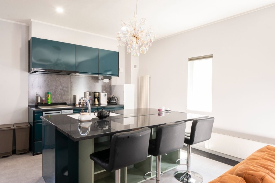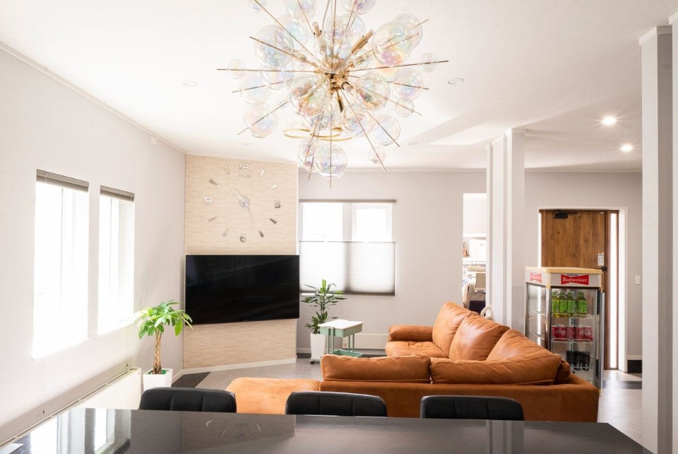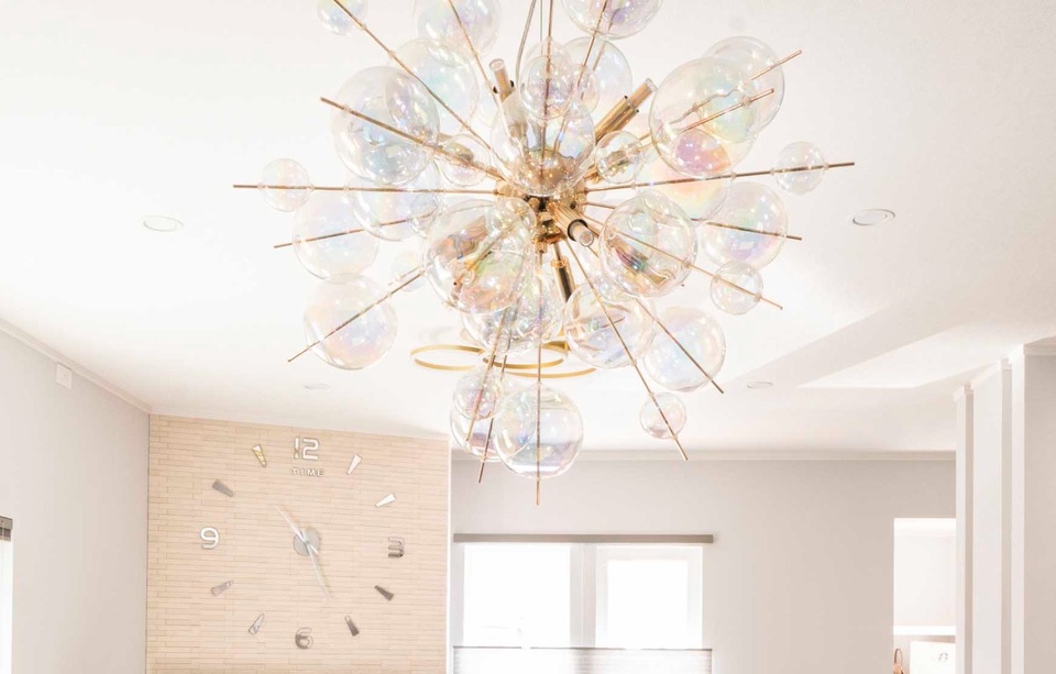 キラキラしたシャボン玉のようなオブジェが印象的な照明、壁に埋め込まれた大きな時計は、奥さまがインターネットで見つけた海外メーカーのもの。「中国語や英語でやり取りしながら苦労して手に入れました」と奥さま。思い入れのあるインテリアです。