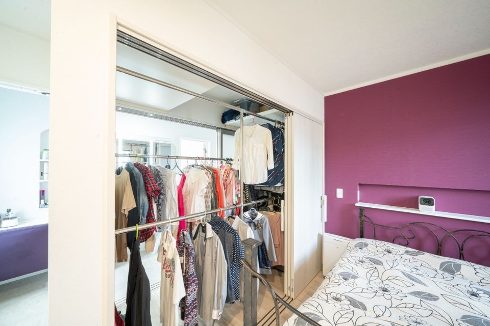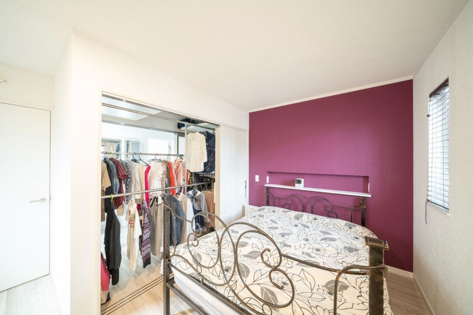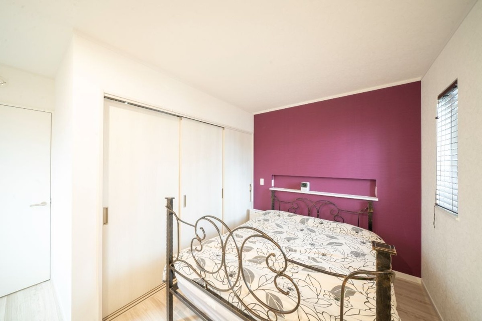 ラズベリー色をアクセントにした主寝室。壁には時計やスマートフォンなど、ちょっとした小物を置ける棚を造作しています。
