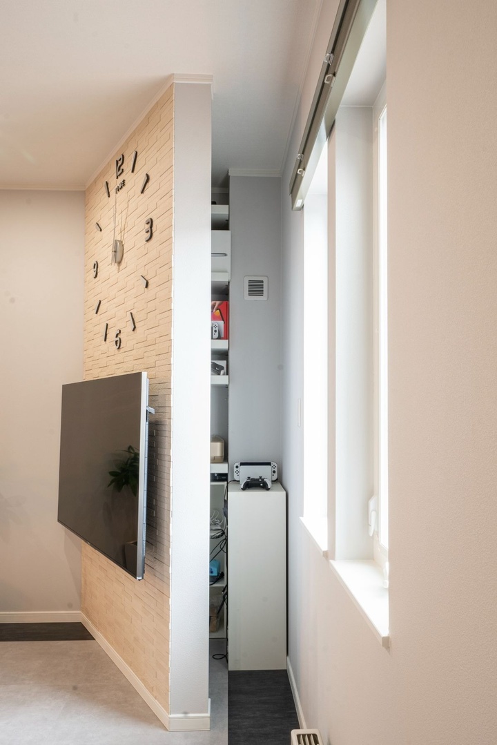 リビングTVの後ろに空きスペースを作ってもらいました。ここにケーブルやコード、通信機器類、ゲーム機などを隠して収納できるので片付けやすく、リビングの広さも保てます。テレビボードもいらず掃除もラクチンです。