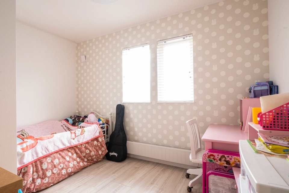 子ども部屋のアクセントクロスは、娘さんと一緒に選んだうさぎのキャラクター模様です。自分の好きな柄が選べて、娘さんも喜んでいたそう。かわいらしい雰囲気の部屋になりました。
