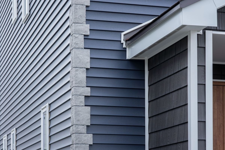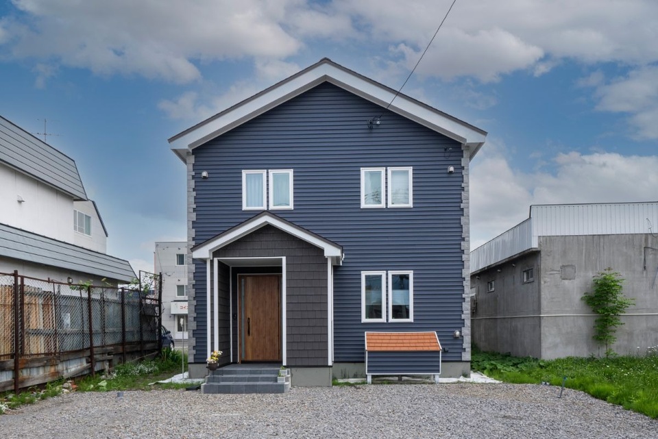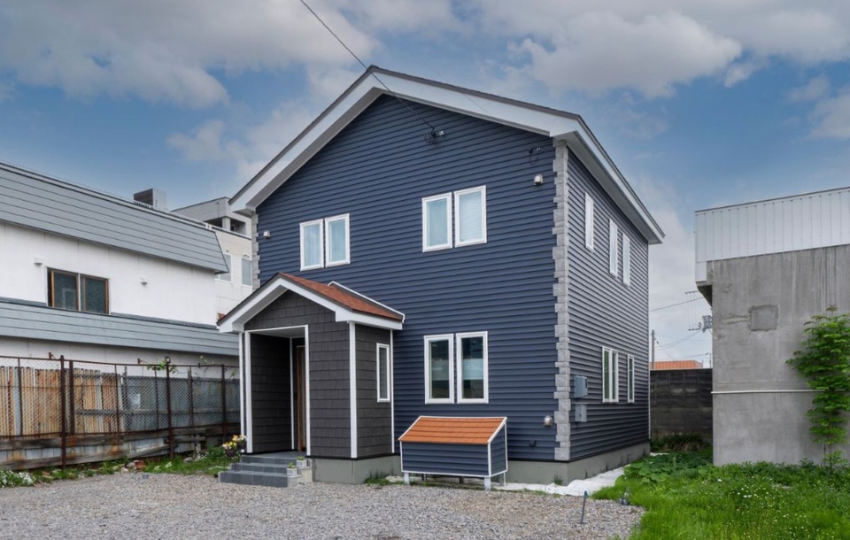 S邸は、外壁のインディゴブルーが映える総二階建てです。設計・施工したのは旭川市にある小森工務店。カナダの輸入住宅「セルコホーム」ブランドを主力とする地場ビルダーですが、今回のように、顧客の要望を踏まえ、自由設計の注文住宅にも対応しています。