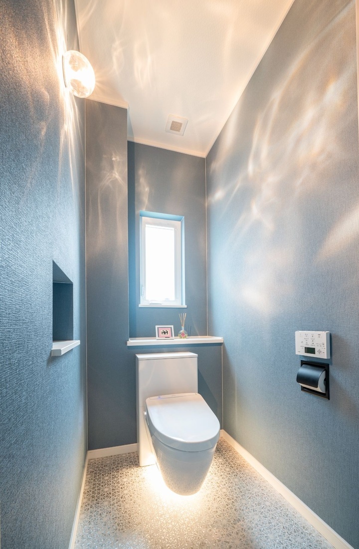 トイレの照明やペーパーホルダーも奥さまのセレクト。壁に反射する光が幻想的です。