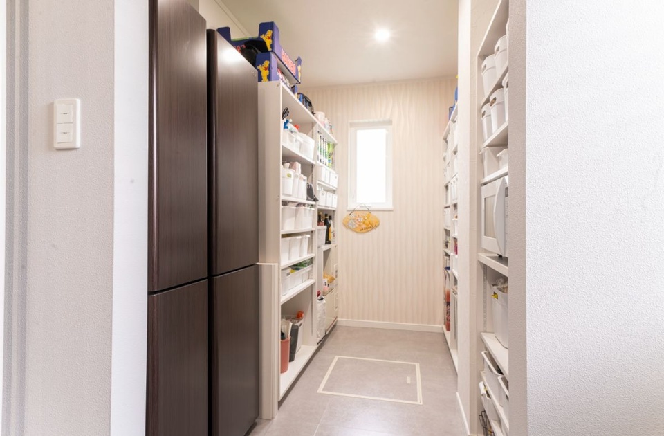 キッチンの横には約4畳の大きなパントリーを完備。冷蔵庫や電子レンジもピッタリ収まっています。食品をはじめ掃除用具なども収納して家全体の生活感をなくしました。