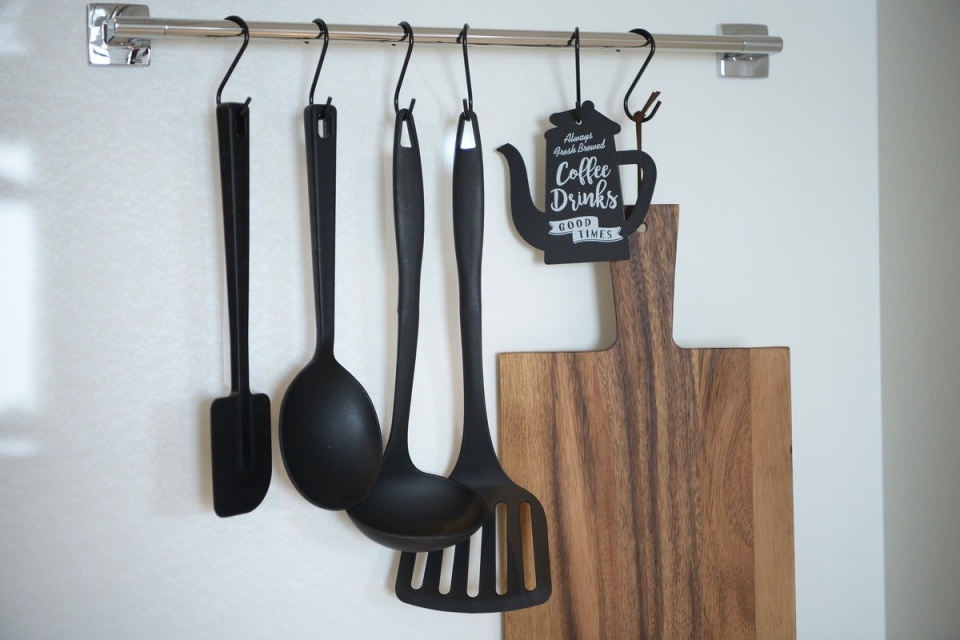 キッチンパネルにはツールを掛けるのに便利なバーを設置。耐荷重が10kgまであり、フライパンを掛けることもできます。お気に入りの道具を飾って楽しみたいですね。