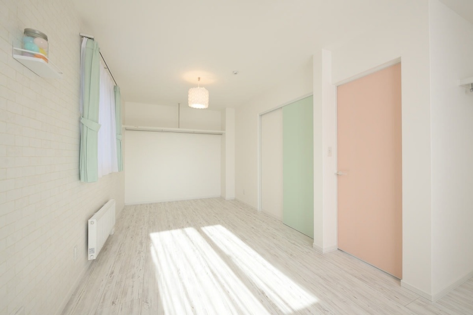 2階子供室は将来的に間仕切りをして2部屋にすることが可能。可愛らしいパステルカラーのドアは、既製品に壁紙を張ったオリジナル。今回新たに採り入れた手法ということですが、ドアがインテリア性の高い自由なキャンバスのようにさえ思えてくる、斬新で魅力的なアイデアです。