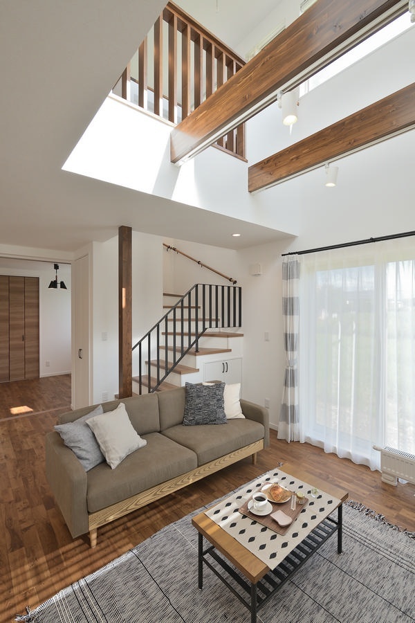 1階の吹き抜けリビングは、上下階でも家族の気配を感じられる造りが魅力。リビング階段にはシンプルなアイアンの手摺をセレクト。「ただいま」の声だけではなく、家族の行き来を見守ることができる。イネスホームが大切にしている家族をつなげる家の形です。