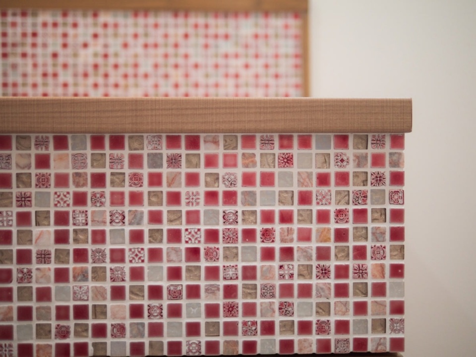 先ほどもご紹介した洗面化粧台には、名古屋モザイクのガラスタイルを採用。ひとつひとつがまるで宝石のように小さなタイルを、職人さんが丁寧な仕事で仕上げています。