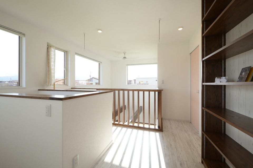 日差しが差し込む明るい2階ホール。物干しポールの取り付けも可能です。右手前の壁には家族共有の本棚が。就寝前の読み聞かせの絵本を置くのも良いですね。
