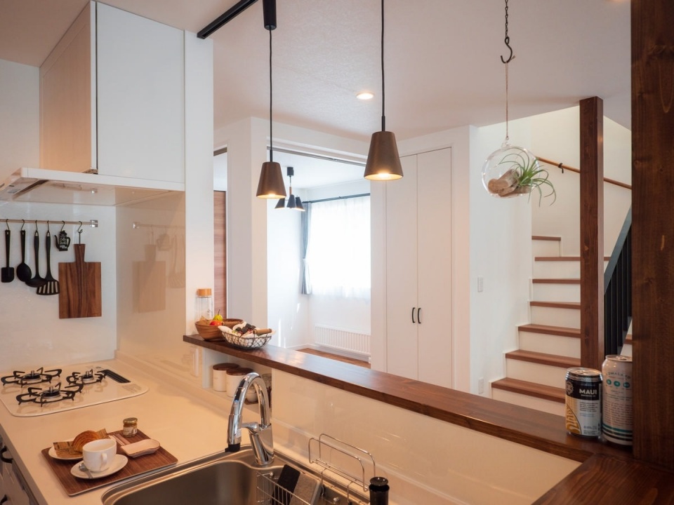 キッチンからはリビング、階段、洋室(写真中央)を見渡すことができます。子どもが小さなうちはプレイルームとして使用することが多い洋室まで視線が行き届く造りは、子育て世代には嬉しい気配りです。