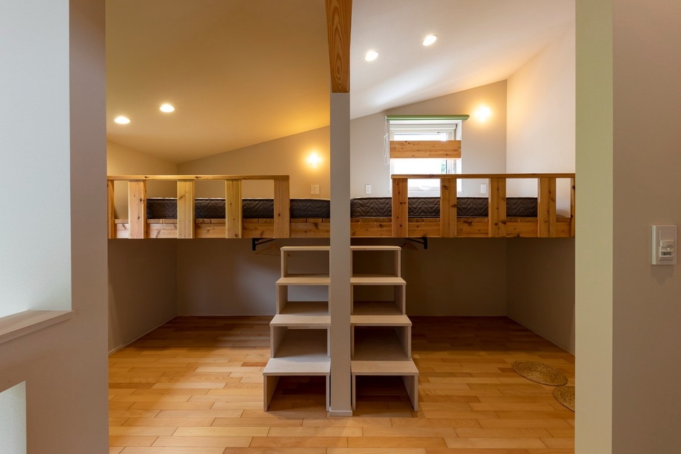 勾配天井を生かしたロフトタイプの空中クローゼットや、ロフトにつながる収納を兼ねた空窓階段など、ユニークな空間活用法も同社が得意とするところです。