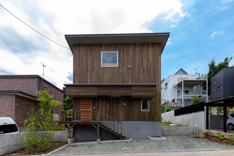 H邸には自然素材がふんだんに使われています。木目がつまった屋久島地杉を外壁に貼り、玄関扉は「チャネルオリジナル」のウエスタンレッドシダーを採用、階段ステップの一部には札幌軟石が置かれています。