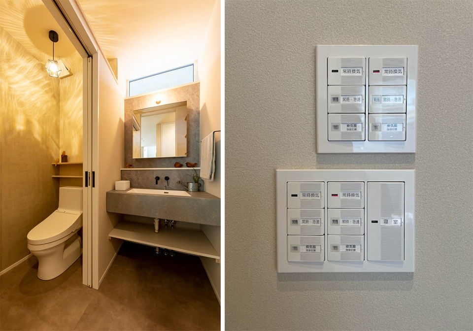 H邸は、1階と2階のトイレの背面の壁に風道が隠れています。空調は、すべてパネルで管理します。
