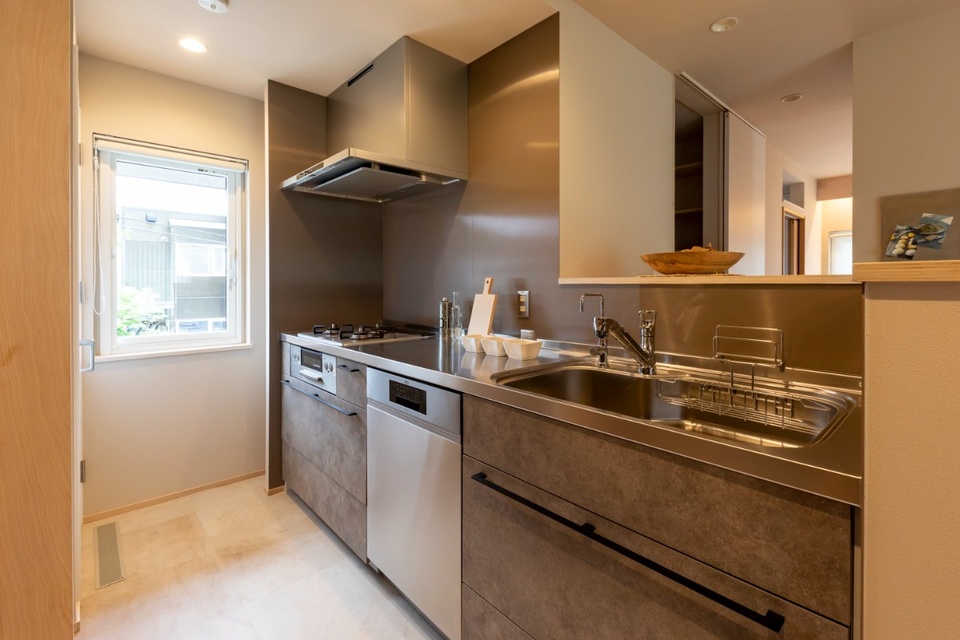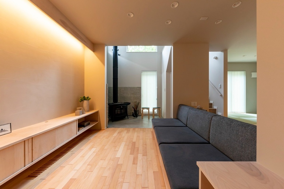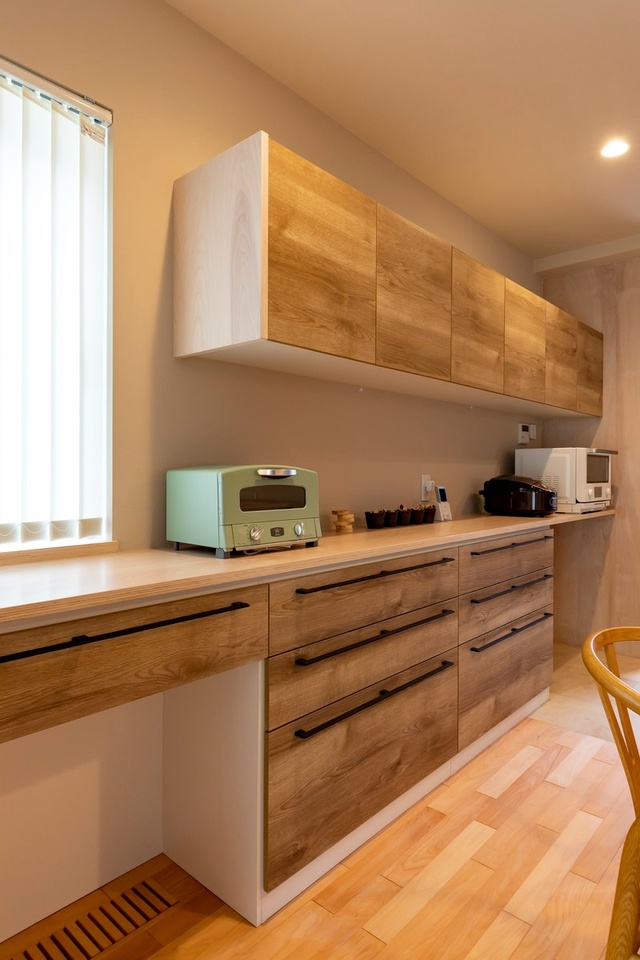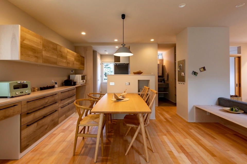 室内は床にブナ材を用い、造作棚などに用いた道産シラカバ材の質感が洗練された空間を演出しています。また、キッチン収納の天板やエンドパネルを見ると、室内のトーンをまとめるためにシラカバ材で覆うひと手間が加えられていました。