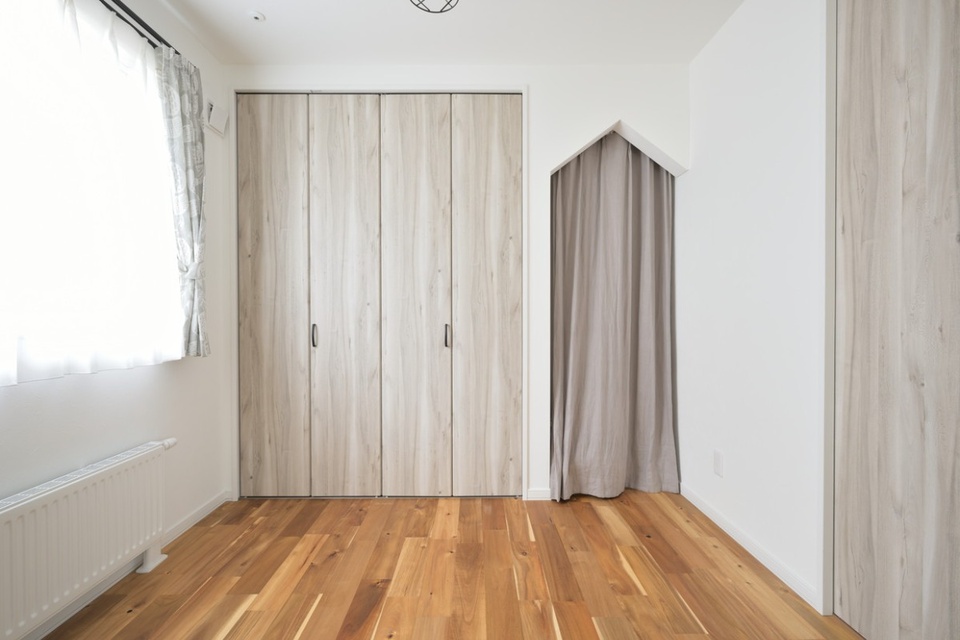 おうち型の下がり壁の付いた物入は、ヌックのような空間で、子どもの隠れ家になりそうです。