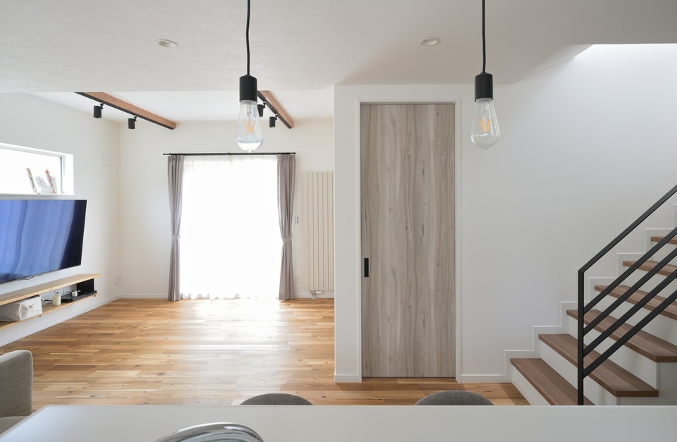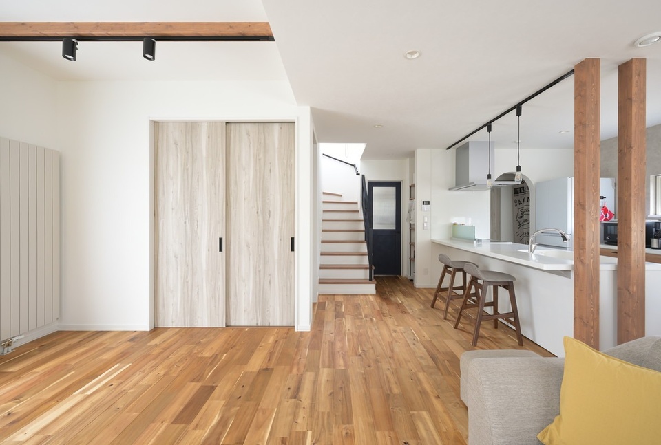 1階には21.5畳のオープンなLDKが広がっています。リビングは吹上天井になっていて、より開放感を演出しています。