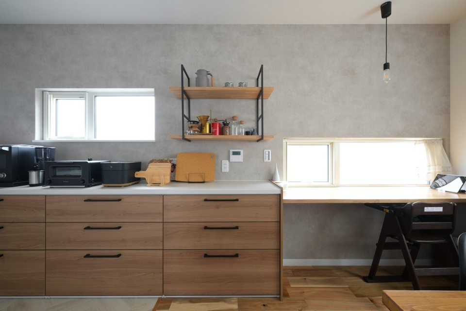 ダイニングの背面には、カウンターテーブルが付いています。このデザインは奥さまお気に入りのカフェ「ボイラー」の窓辺からインスピレーションを得て実現したのだそう。