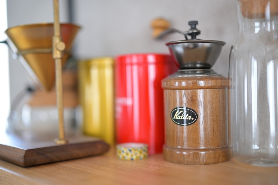 アイアンのオープンラックには、奥さまが大好きなコーヒーのアイテムが並んでいます。