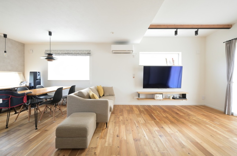 リビングは当初吹き抜けにするか迷いましたが、上階に少しでもスペースが欲しかったので吹上にしてもらいました。そのおかげでフリースペースが出来ました。将来はここにピアノを置く予定です。