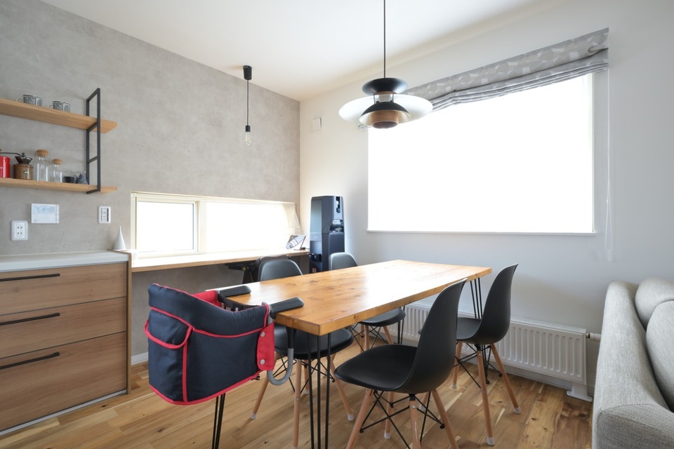 2面採光の明るいダイニング。モルタル調のアクセントクロスでシックな雰囲気に仕上がりました。