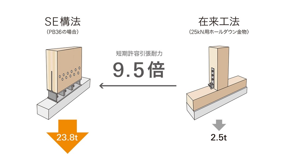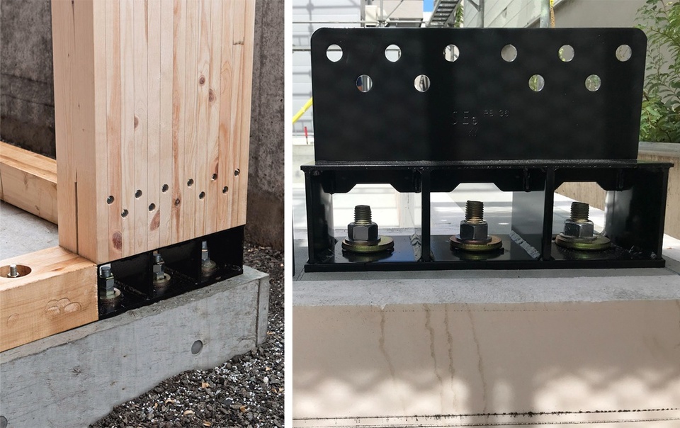 SE構法の「柱脚金物」は、基礎と柱を直接連結することで、引き抜き耐力が大きく向上しています。