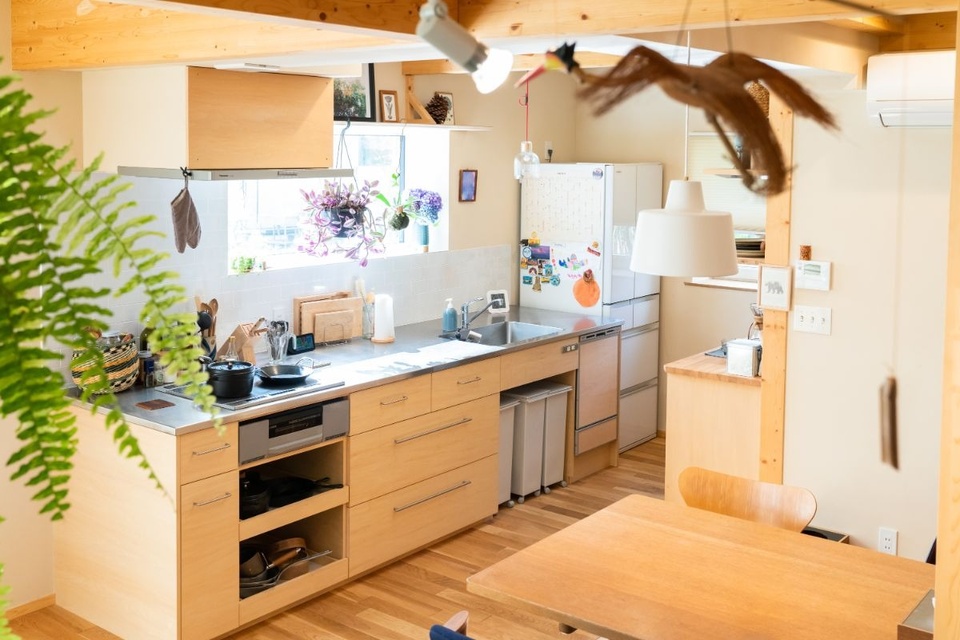 藤井工務店ではキッチンや家具がオーダーできます。このキッチンも、背の高いご夫婦に合わせて通常より高さを上げました。カウンター下の収納など細かなところまで要望を取り入れ、造られています。