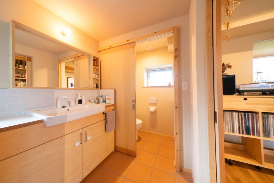 トイレとユーティリティは1カ所にまとめました。洗面収納もオーダーによるもの。床材はテラコッタタイルにしたので掃除しやすく衛生的です。