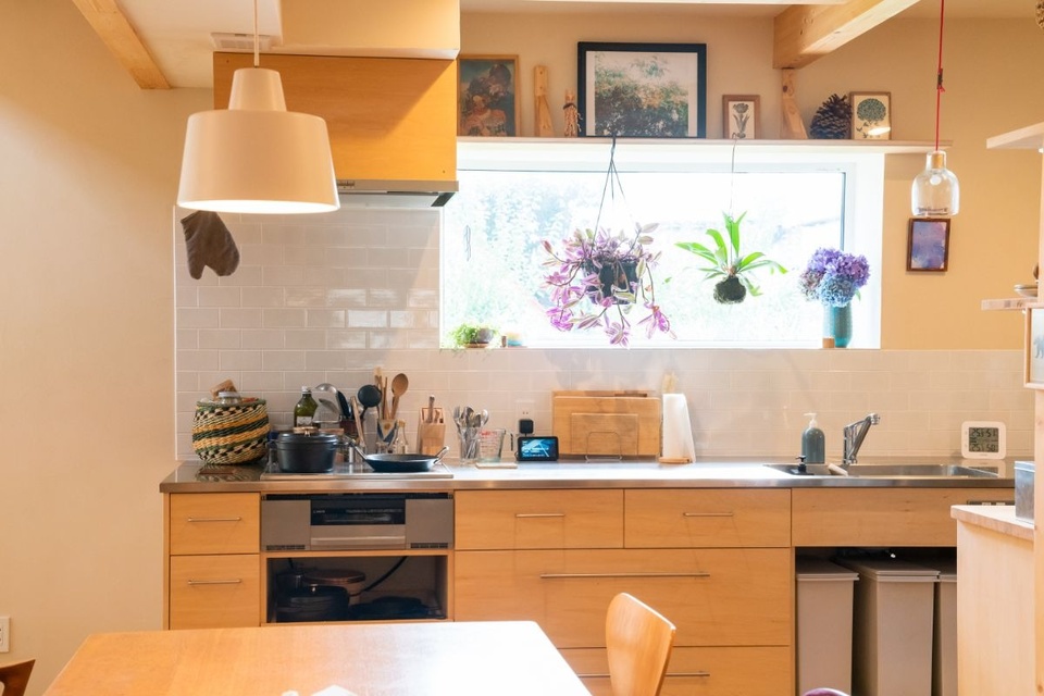 キッチン前面の壁は清潔感のある白いタイルにしました。採光に大きく窓を取り、窓辺に好きな植物を吊るして育てています。