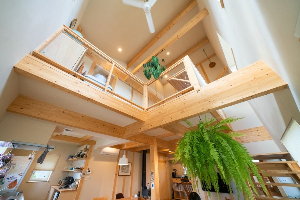 リビング上部は吹き抜けになっていて、2階の落下防止用の柵を強化ガラスにして開放感をもたせています。