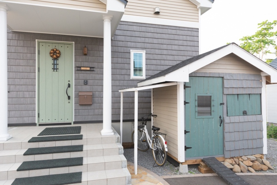 ご自身で図面を書き、材料を揃え加工、住宅の外装と色や素材感も合わせました。一冬経過しましたが、積雪荷重にも耐え、鍵の建て付けなどを調整した程度。家の可愛らしさをさらに高めています。