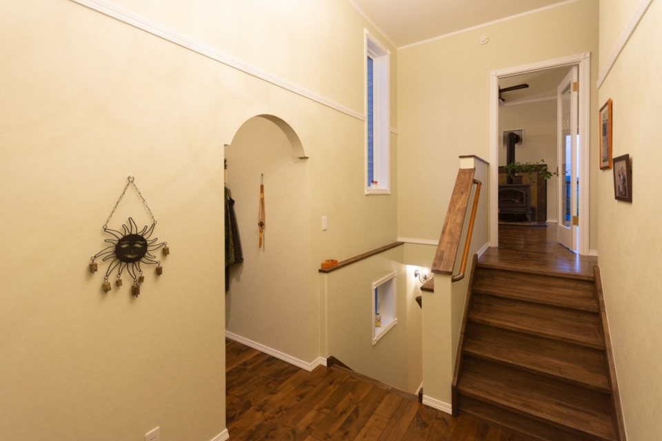 お客様を最初に迎えるエントランスホールは、輸入住宅の重要なポイントの一つです。天井の高さに加え、T邸では上下階があるスキップフロア構造で立体感もあります。