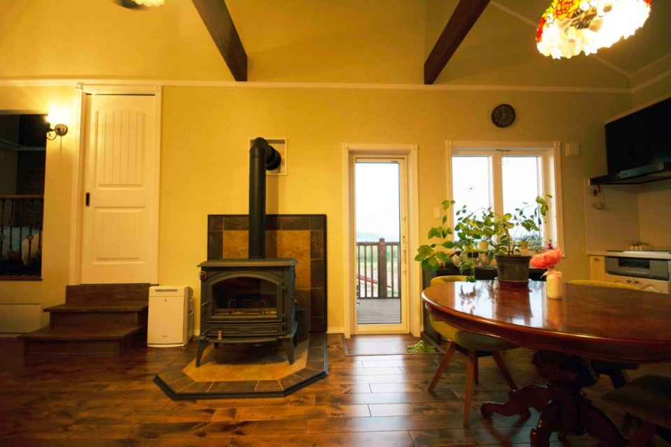 リビングに入ると正面に薪ストーブがあります。冬になると炎のゆらめきを眺めながら暖まると気持ちも癒やされるそうです。