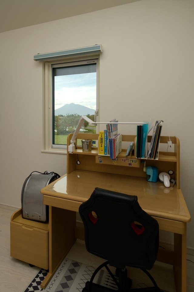 居室スペースは横並びで3つ設けていて、どの部屋からも岩木山が眺められます。息子さんの部屋は学習机のすぐそばに窓が。