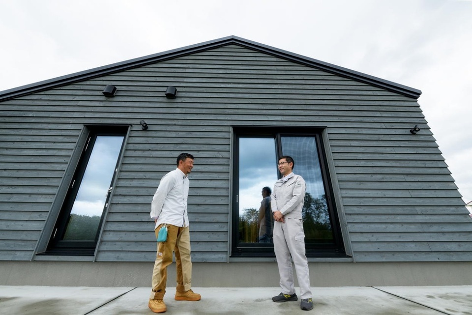 外壁に使っているのは地元・青森の杉板で、下の板の上に重ねながら張っていく鎧張り仕上げはSさんが希望したもの。色もブルーグレイとシルバーグレイの割合を変えたサンプルを、小野住建の小野裕之さんが複数色用意した中からSさんが選びました。