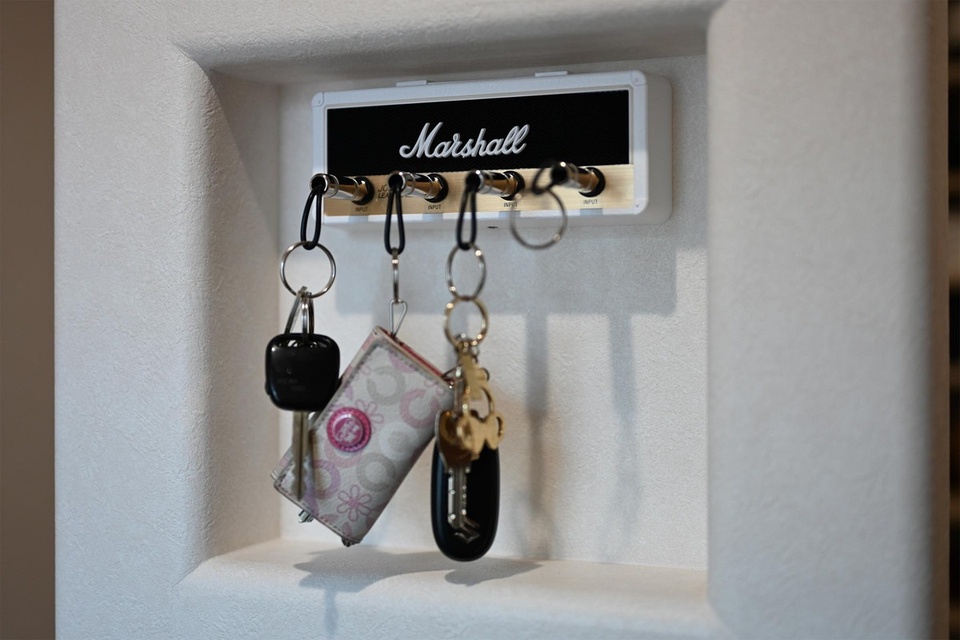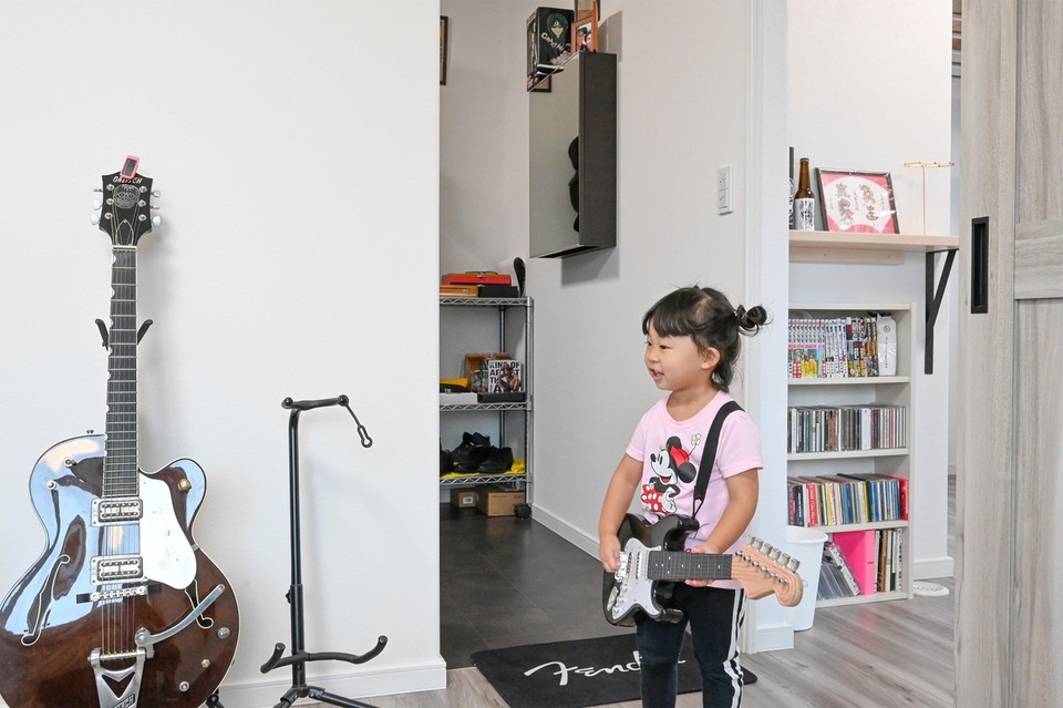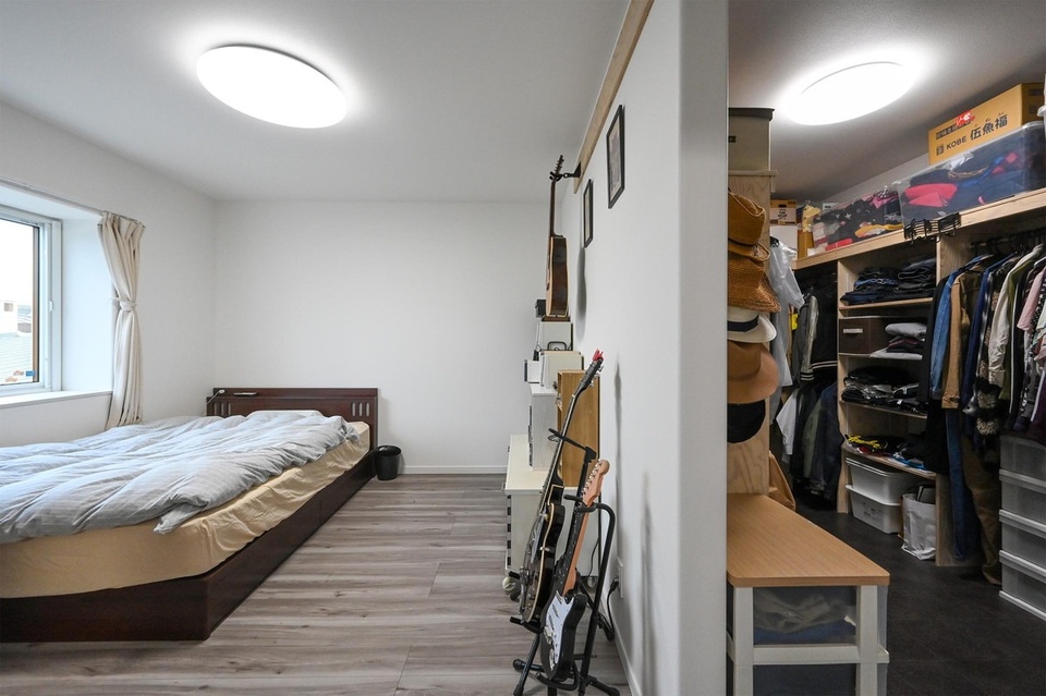 2階のご夫婦の寝室には、バンドでギターを弾くSさんのこだわりから、壁に下地板を施工してギターを飾れるように。