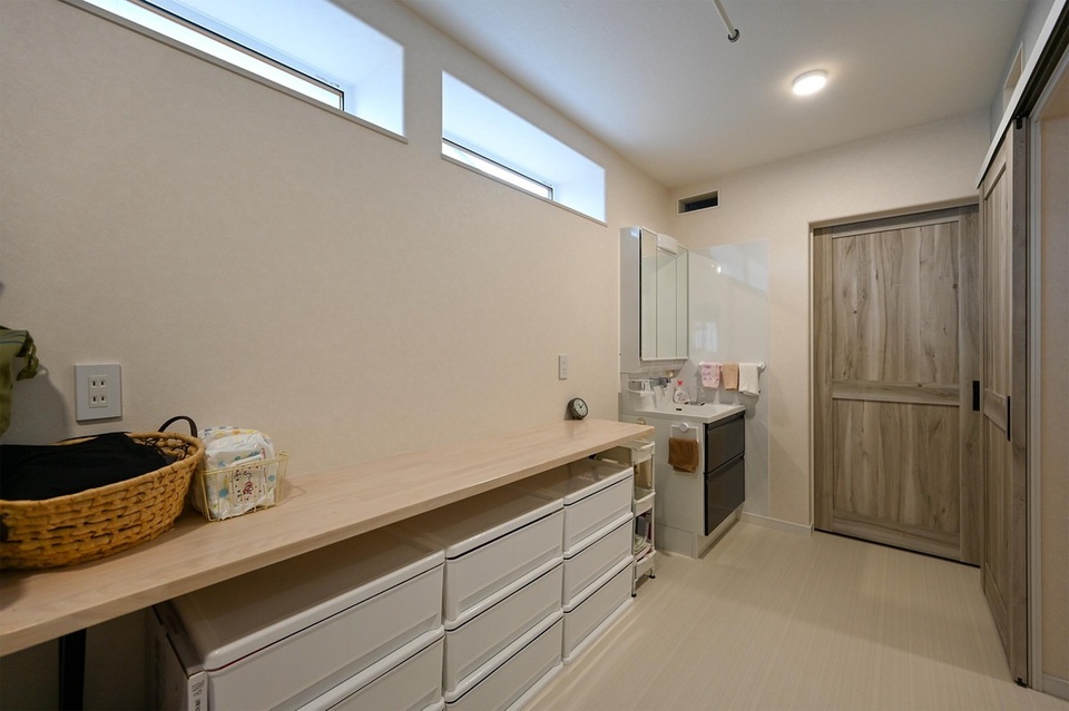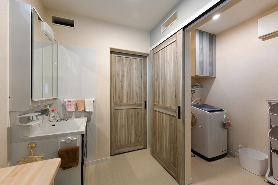 キッチン横の洗面室はゆったり設計。洗濯物を畳んだりアイロンをかけられるよう、幅広いカウンターを付けました。奥の扉はお母さまの部屋につながっていて、直接洗面室や浴室に行ける動線を作っています。ご夫婦の友人が訪ねてきても「気にせず動けて便利」とお母さまは話します。