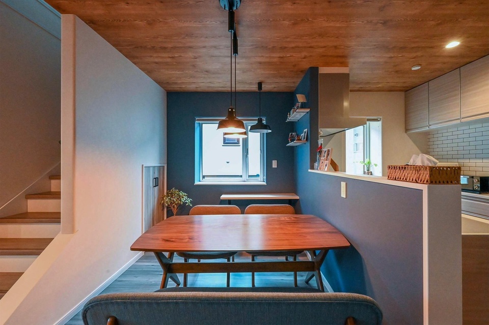 キッチンに隣接したダイニングはネイビーブルーのクロスに。奥さまが特にこだわったのが、このダイニング。クロスの色はもちろん、低めのテーブルや座り心地のよい椅子を選んだお気に入りの空間です。窓辺にはカウンターテーブルも置き、ちょっとした作業ができるよう工夫されています。