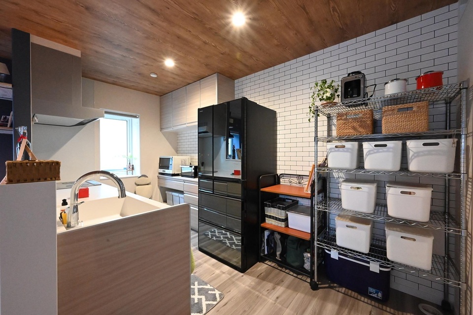 キッチンの壁面には、カフェ風インテリアで人気のサブウェイタイル調の壁紙を選んでいます。