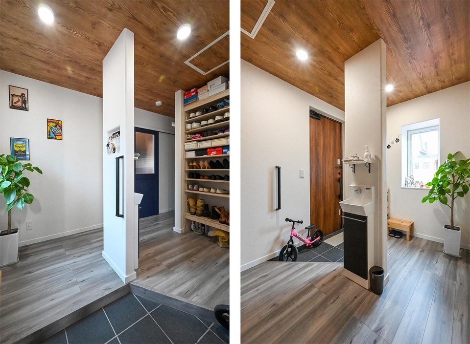 玄関はシューズクロークとホールを小さな仕切り壁で区切り、感染症対策のためにコンパクトな手洗いも設けました。
