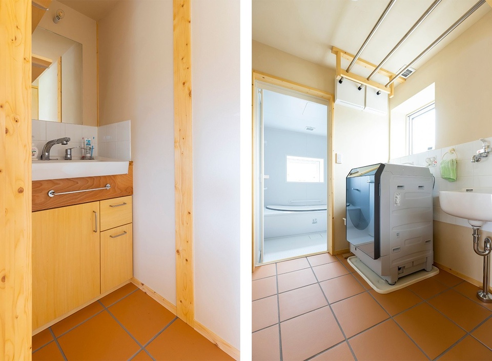 ほかにも夫婦の希望はさまざまな場所に取り入れられています。たとえば洗面は独立させ、その分、脱衣所に小さなシンクを取り付けました。洗面の造作は藤井さんのオリジナルです。