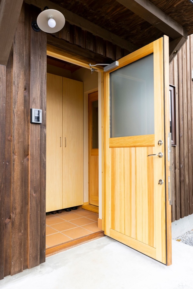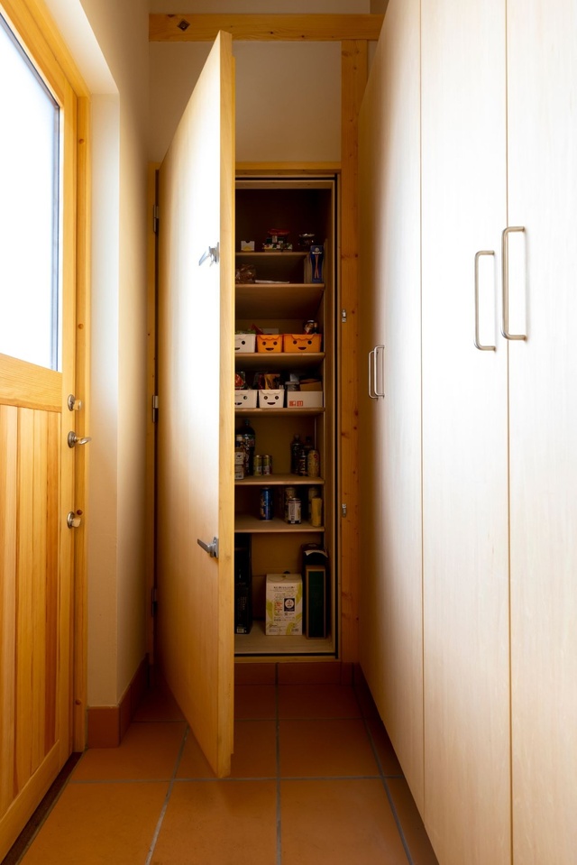 また、共働きのため欠かせないと希望したのが食品庫です。買い物から帰宅するとすぐ食材などを収納できるように玄関に食品庫を配置しました。