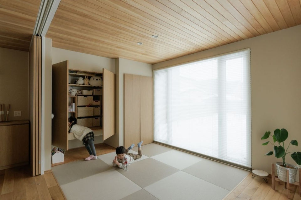 キッチンから見守れる位置にある和室は子どもたちものびのびと過ごせる場所。扉を閉じて使えば客間として宿泊も可能です。