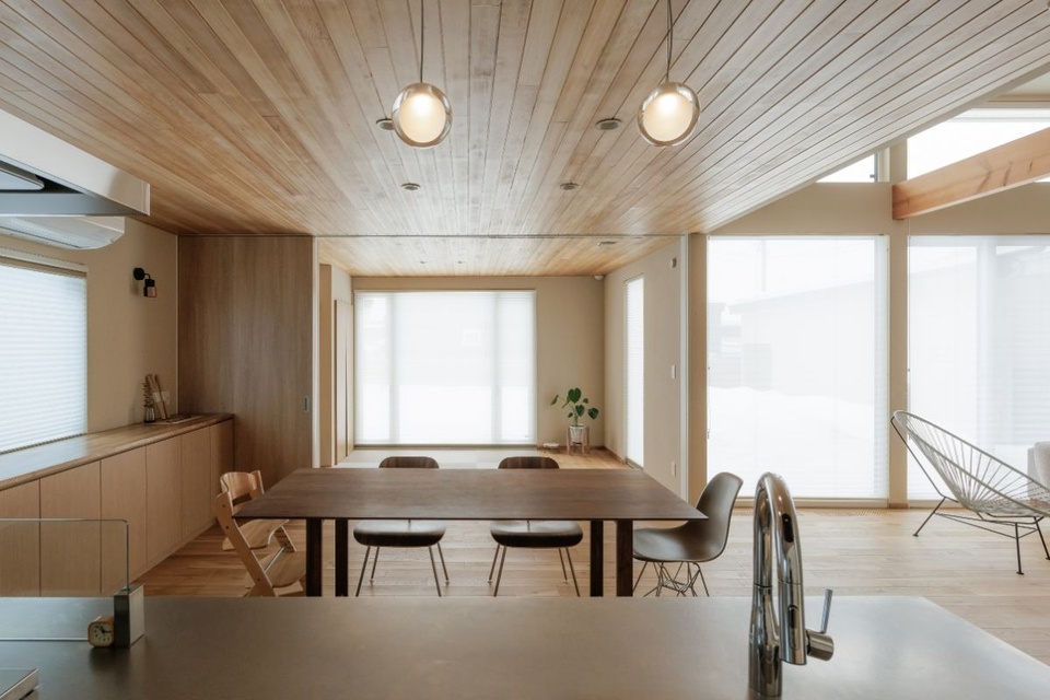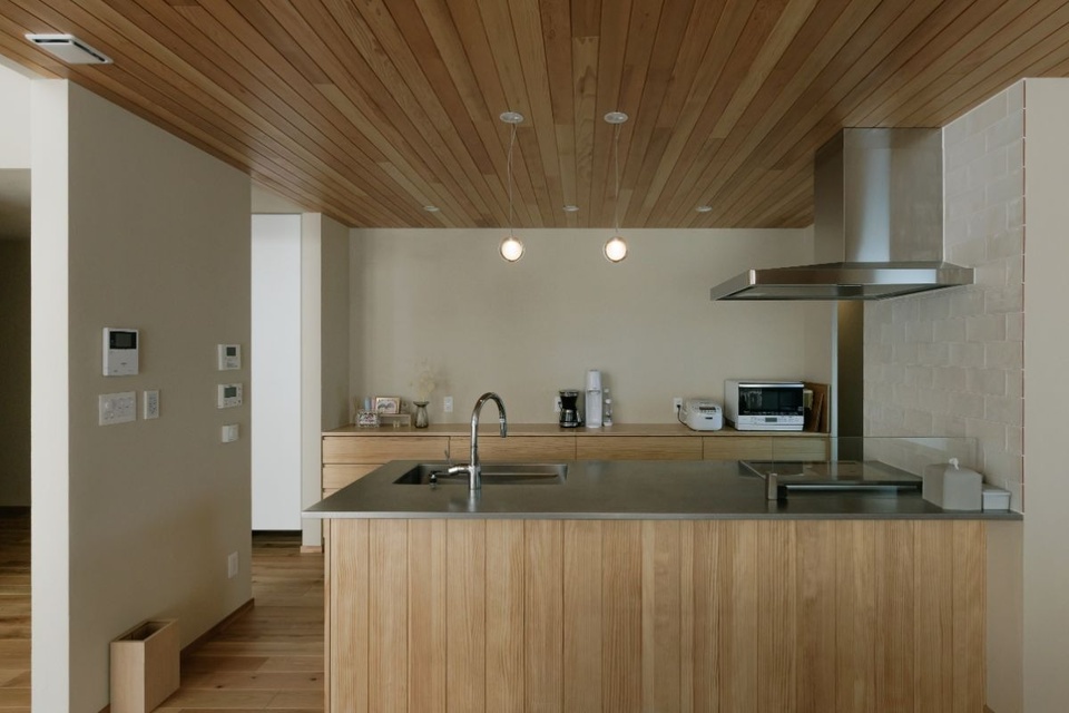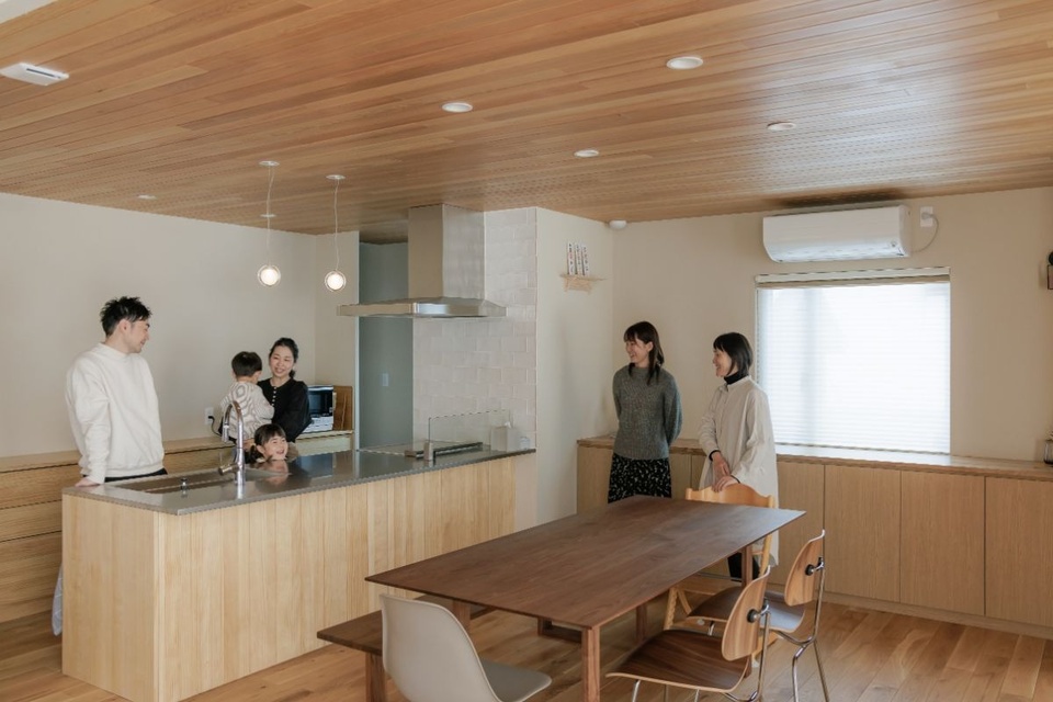 インテリアでは「本物の自然素材を使ってほしい」というご夫妻の要望を可能な限り実現しました。キッチンからダイニング、和室へと続く天井にはヘムロック(ベイツガ)の羽目板を使用しています。