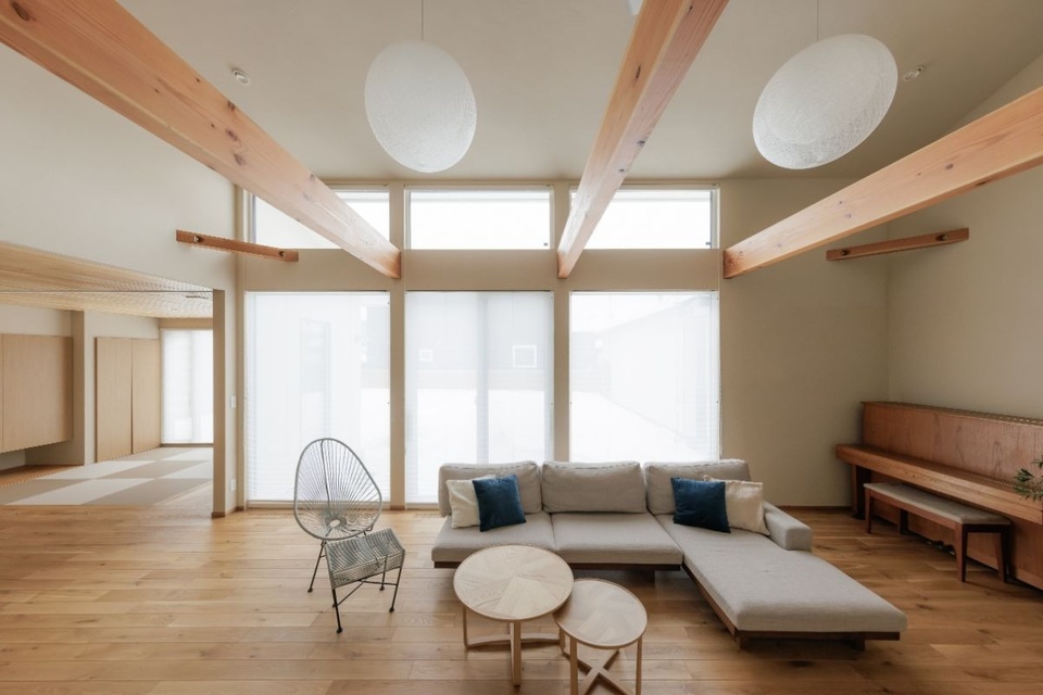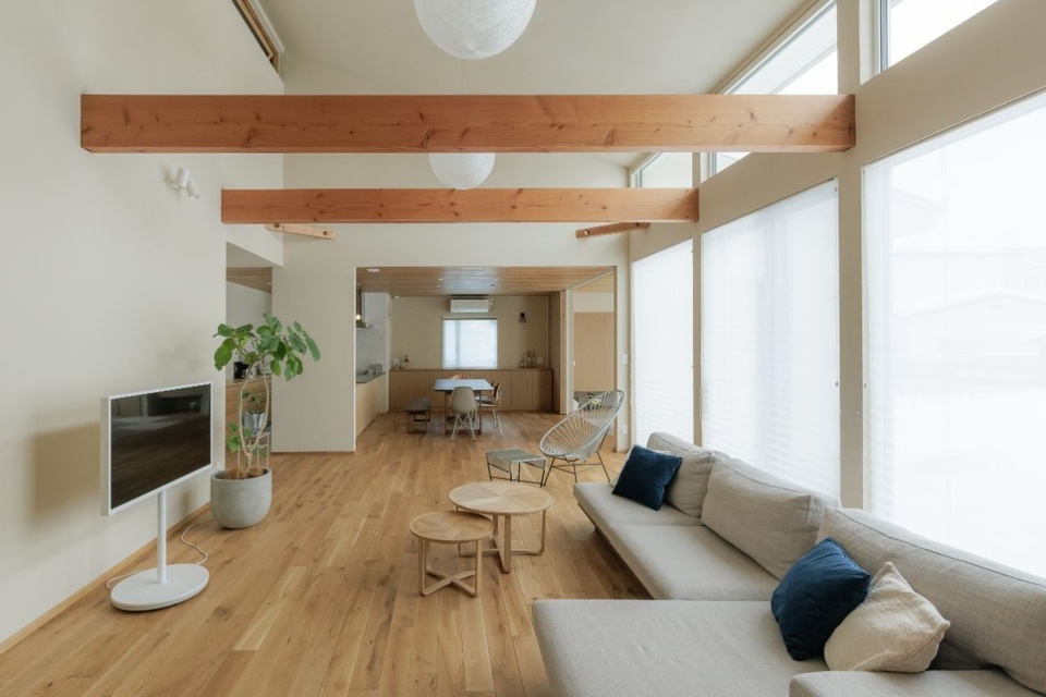 カラマツの梁にナラの無垢床……木の質感あふれるLDKでそう話してくれたのは、Sさんファミリーです。「リビングは子どもたちがここにいる間も、巣立った後も家族の生活の中心」と、各部屋の広さにメリハリをつけたいというのが要望の1つでした。