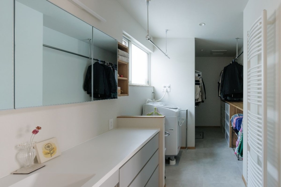 「間取り・動線がシンプルだからこそ暮らしやすいんです」と奥様。洗面所の奥には乾燥スペース、ファミリークローゼットが続き、「洗う・干す・畳む・しまう」といった家事が一箇所で完結する家になりました。