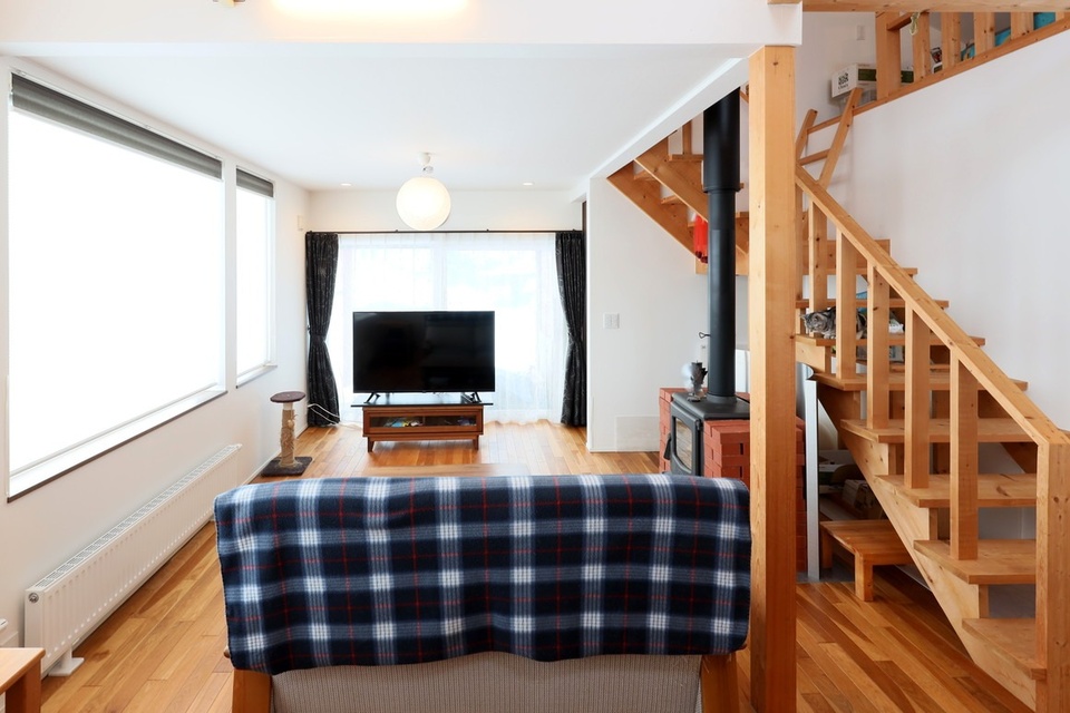 LDKの中心には薪ストーブがあり、空間全体を暖めています。2つのロフトは、テレビを観たり、洗濯物を干したり、ストレッチをするスペースとして活用しています。