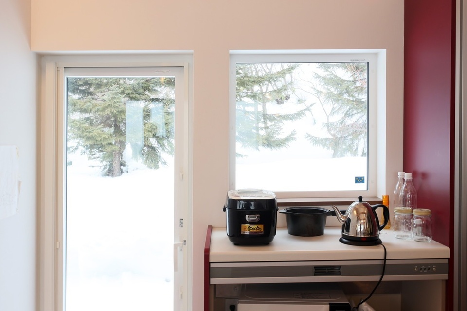 キッチンから見える裏山には、キツネやエゾシカが現れることも。すぐそこに、四季折々の自然や野生動物の息づかいを感じる暮らしです。